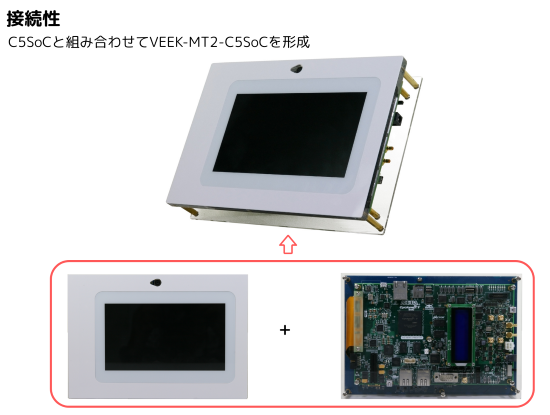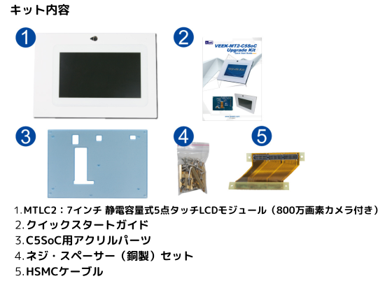 Video and Embedded Evaluation Kit - Multi-Touch for C5SoC アップグレードキット(第2版)(VEEK-MT2-C5SoC Upgrade Kit)は、すでにIntel C5SoCボードをお持ちのお客様向けに、さまざまな組込みアプリケーションを開発できる新しい統合プラットフォームを提供します。