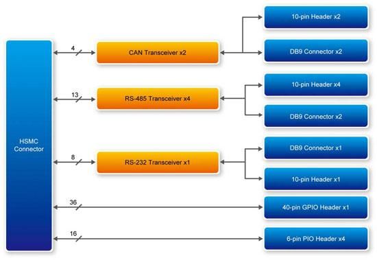 産業用通信ボード(ICB-HSMC)は、高速メザニンカード(HSMC)を介したRS232、RS485、およびCAN(コントローラーエリアネットワーク)を含む産業用通信をサポートするように特別に設計されています。